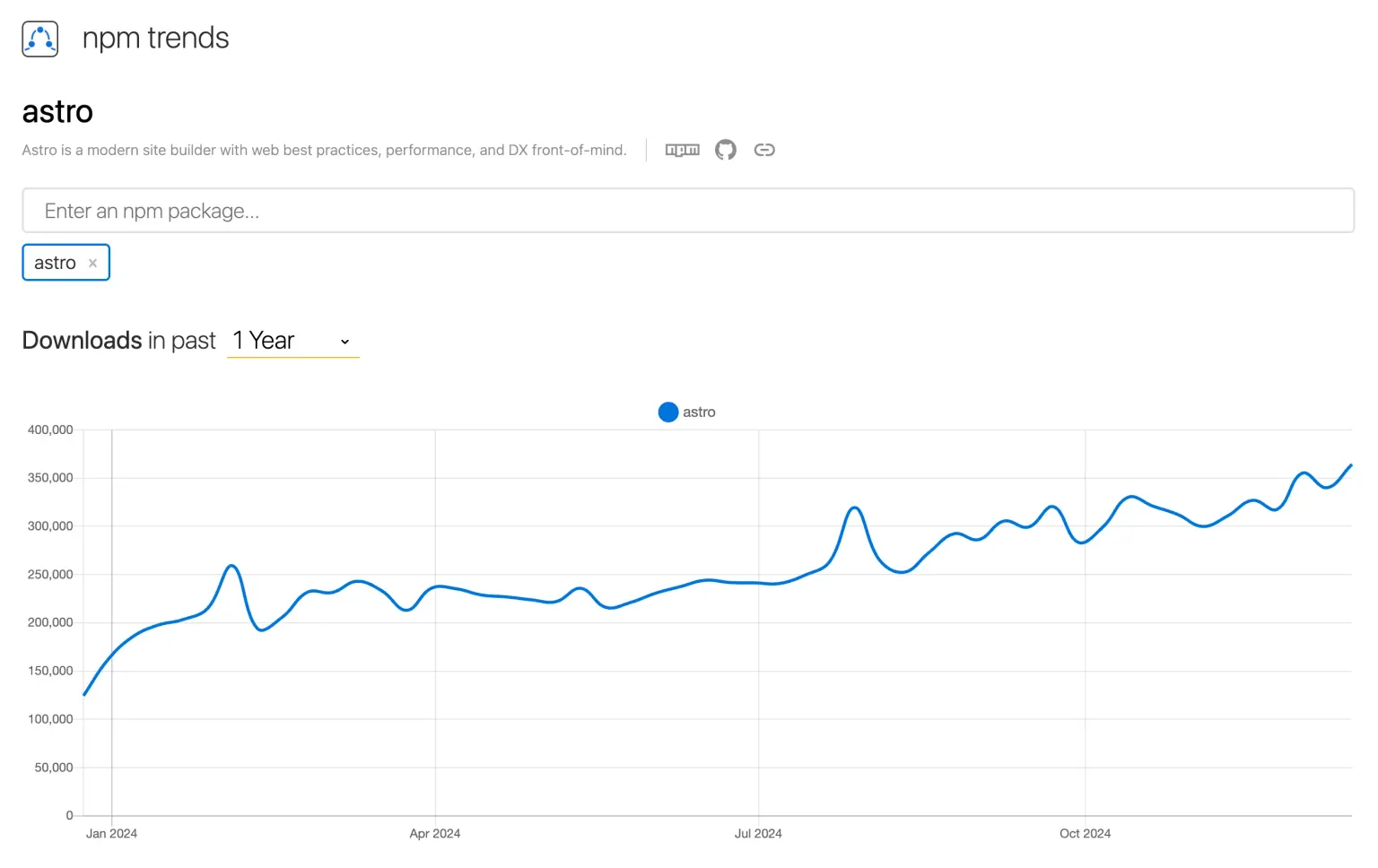 Based on npm trends, weekly downloads of Astro were 185,902 at the start of 2024, climbing to 364,201 as of December 15. That’s approximately double, so Astro is clearly growing at a steady pace here as well.